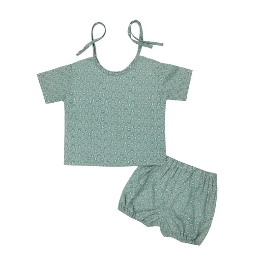 Cotton Jhabla Set for Infants | 2 Piece - Floral Print I Sea Green